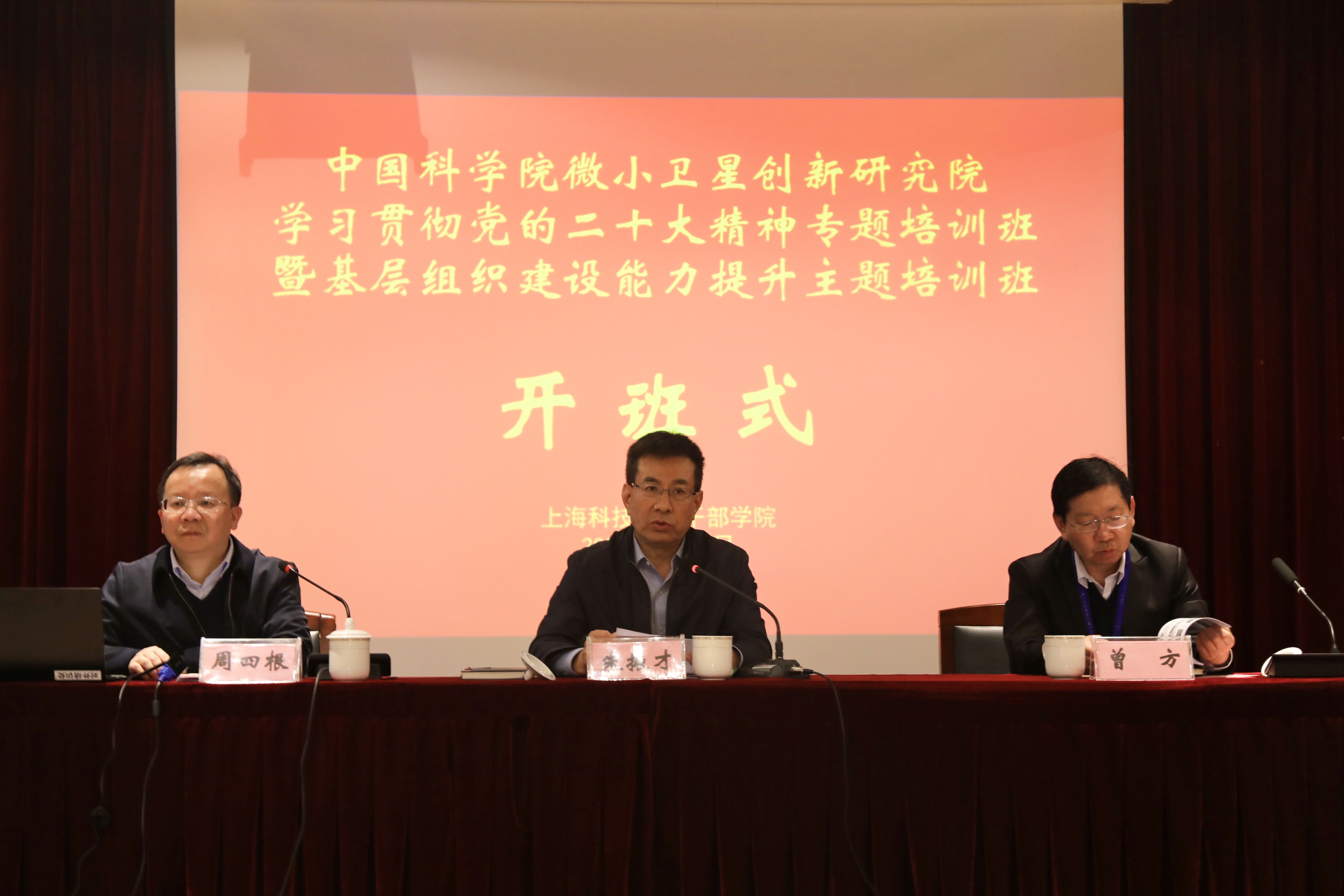 为深入学习贯彻党的二十大精神,进一步提升党务干部和青年骨干的政治素养和实干能力,不断提升基层组织建设水平,2023年4月24日至25日,卫星创新院在上海科技管理干部学院举办学习贯彻党的二十大精神专题培训班暨基层组织建设能力提升主题培训班。上海科技管理干部学院院长、党委副书记曾方,卫星创新院党委书记、副院长朱振才,党委副书记、纪委书记周四根出席开班式,党务干部和青年理论学习小组等50余人参加培训。